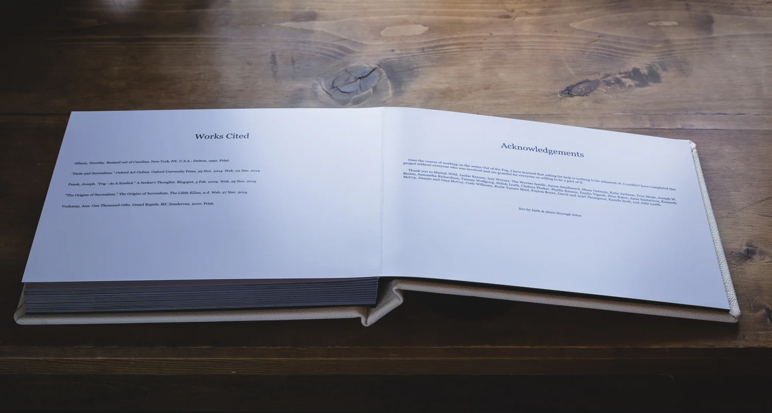 What started out as a class project for Thesis has grown into a special personal project. Out of the Fog focuses on self-worth through symbolism, and I may eventually open the series back up. As the project grew into something so very important to me, I wanted to make sure the final product, which was to be a self-published book without limits of dimension or company, was printed to show the significance of each person who took part in the series.